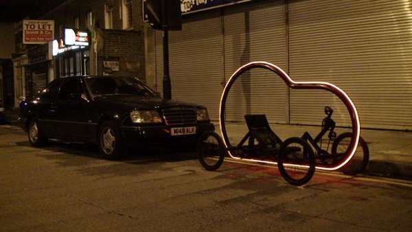 Part bike, part car, part… halo? Ben Wilson’s Artikar is a four-wheeled recumbent bicycle enclosed within a fluorescent light halo. The light may be all for show, but bikes tend to be as much about style as they are about transportation nowadays. Recumbent bikes can register some pretty high speeds, and this flashy light becomes a safety measure when Ben weaves through the busy traffic in downtown London. Nice work, Mr. Wilson.